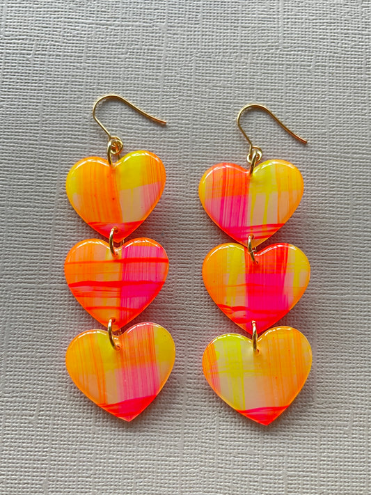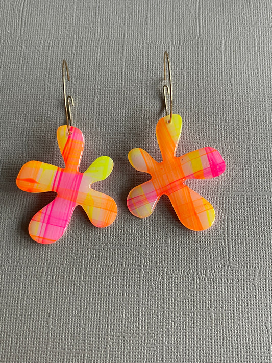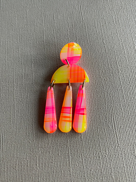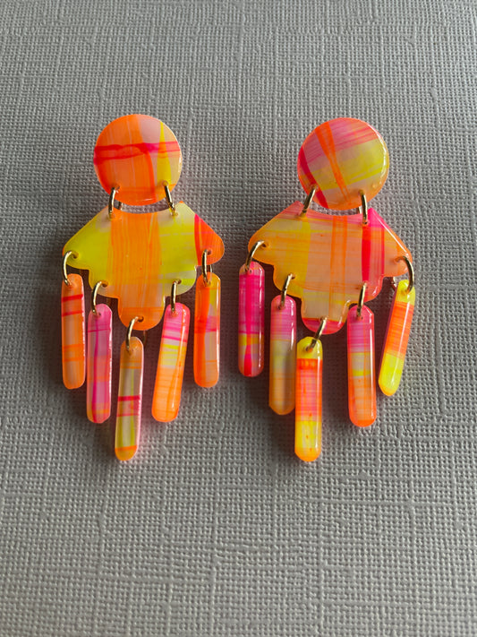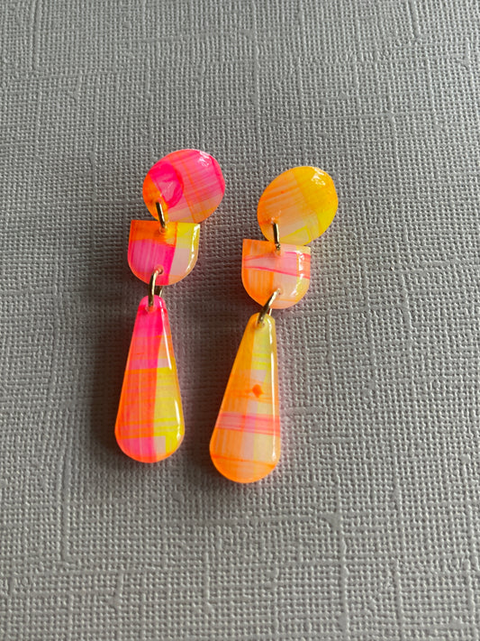 One of a kind earrings made from hand painted neon acrylics in classic Rainbow Resins colours of pink, orange and yellow, sealed with high quality resins. Each piece is made to order if not already available in stock.