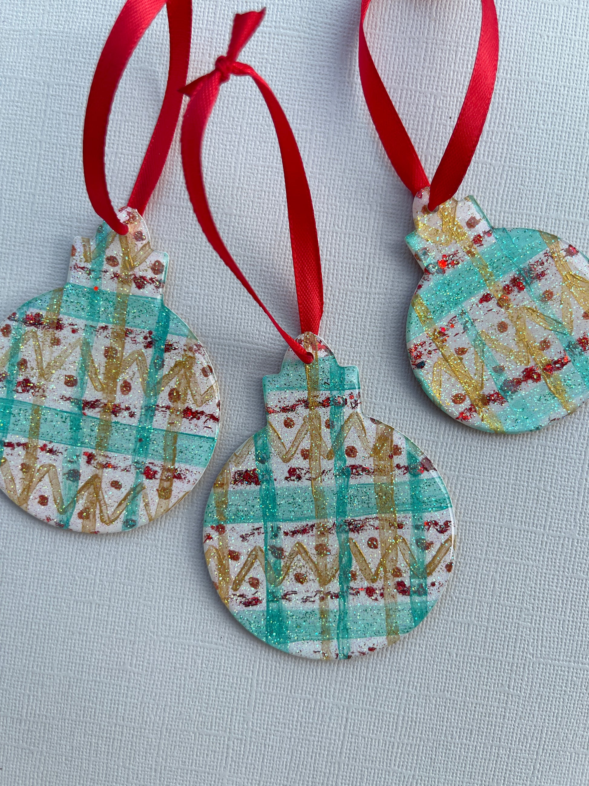 One of a kind Christmas tree ornaments made from hand painted Christmas cracker themed artwork.