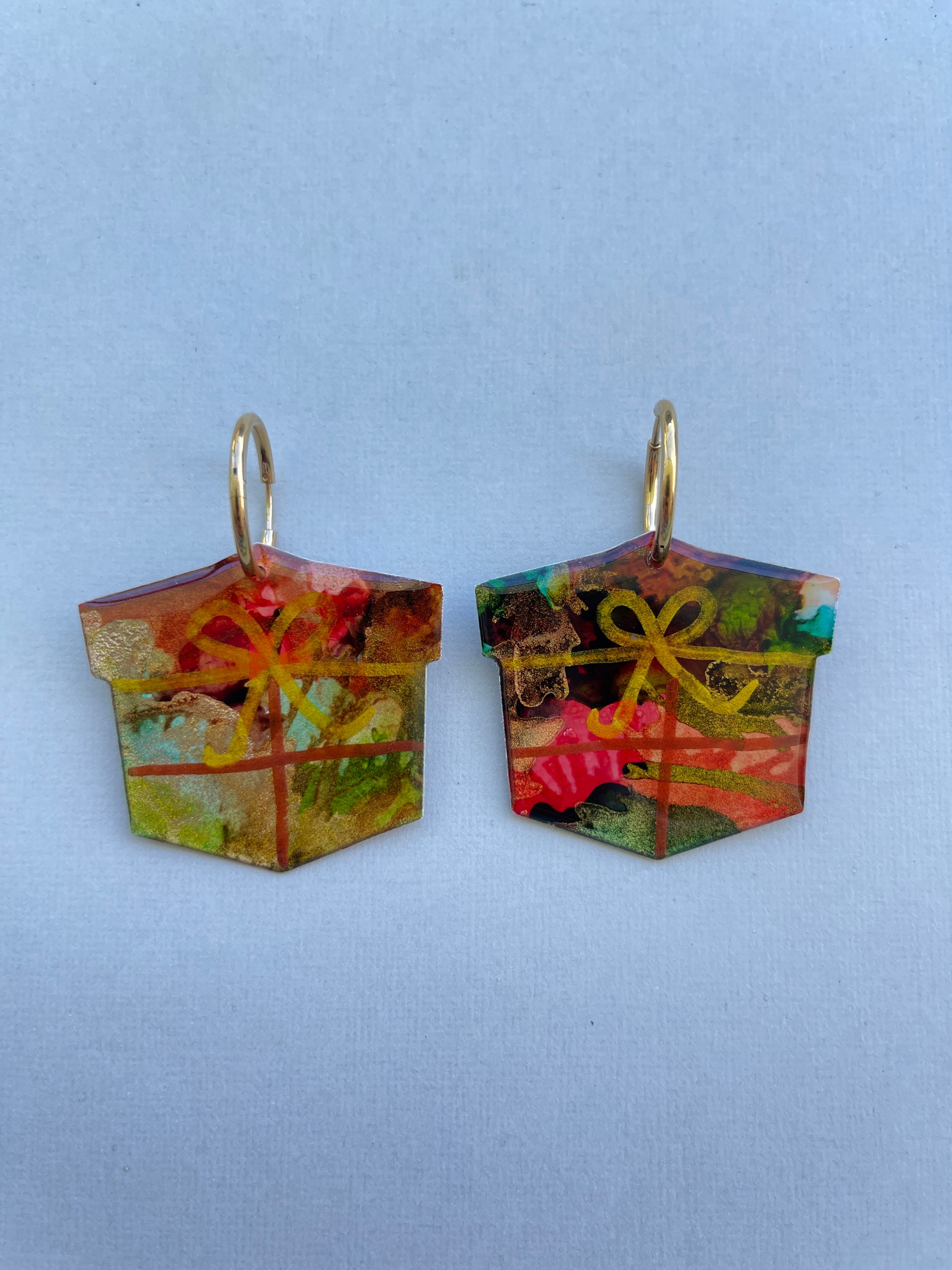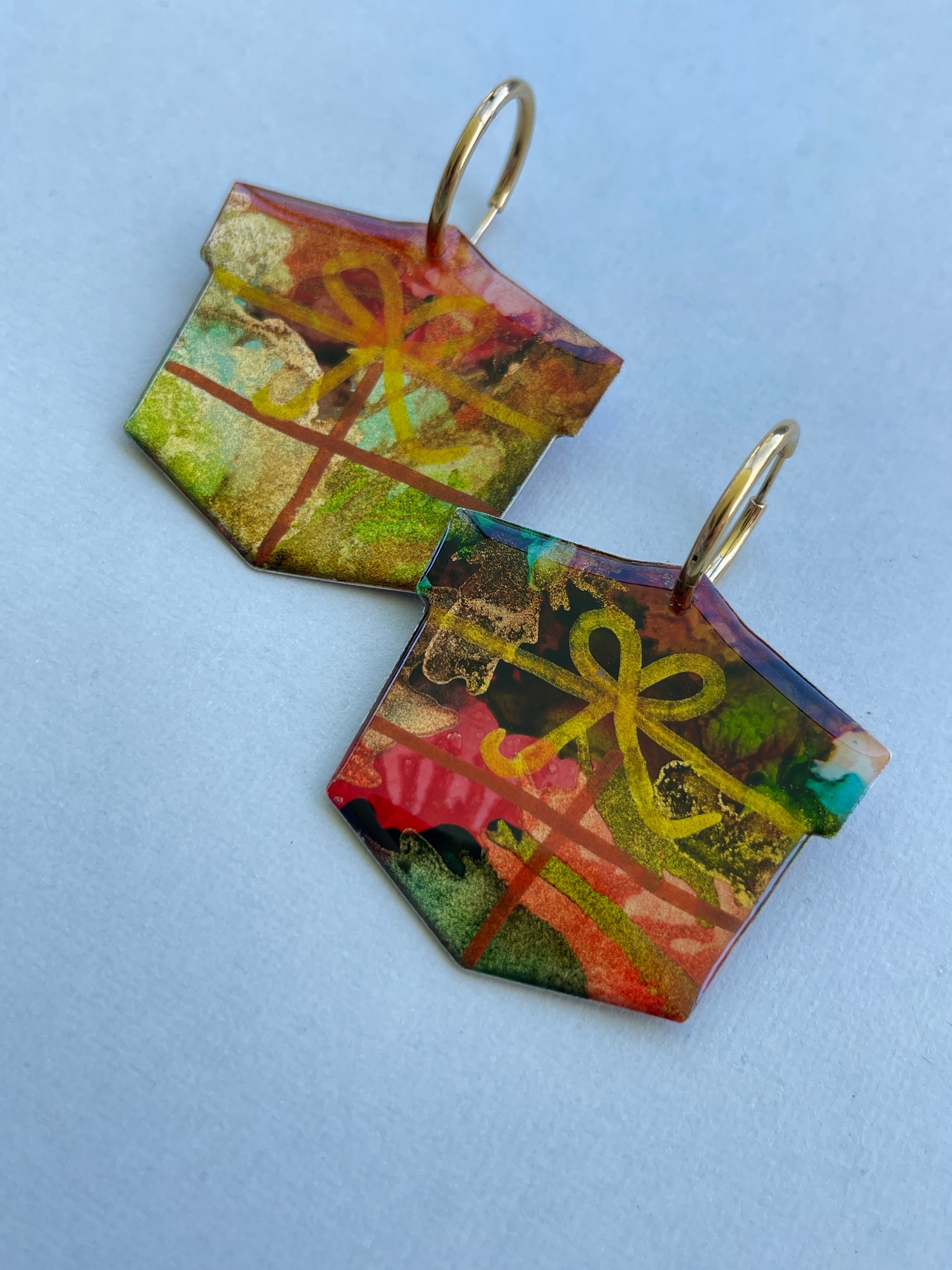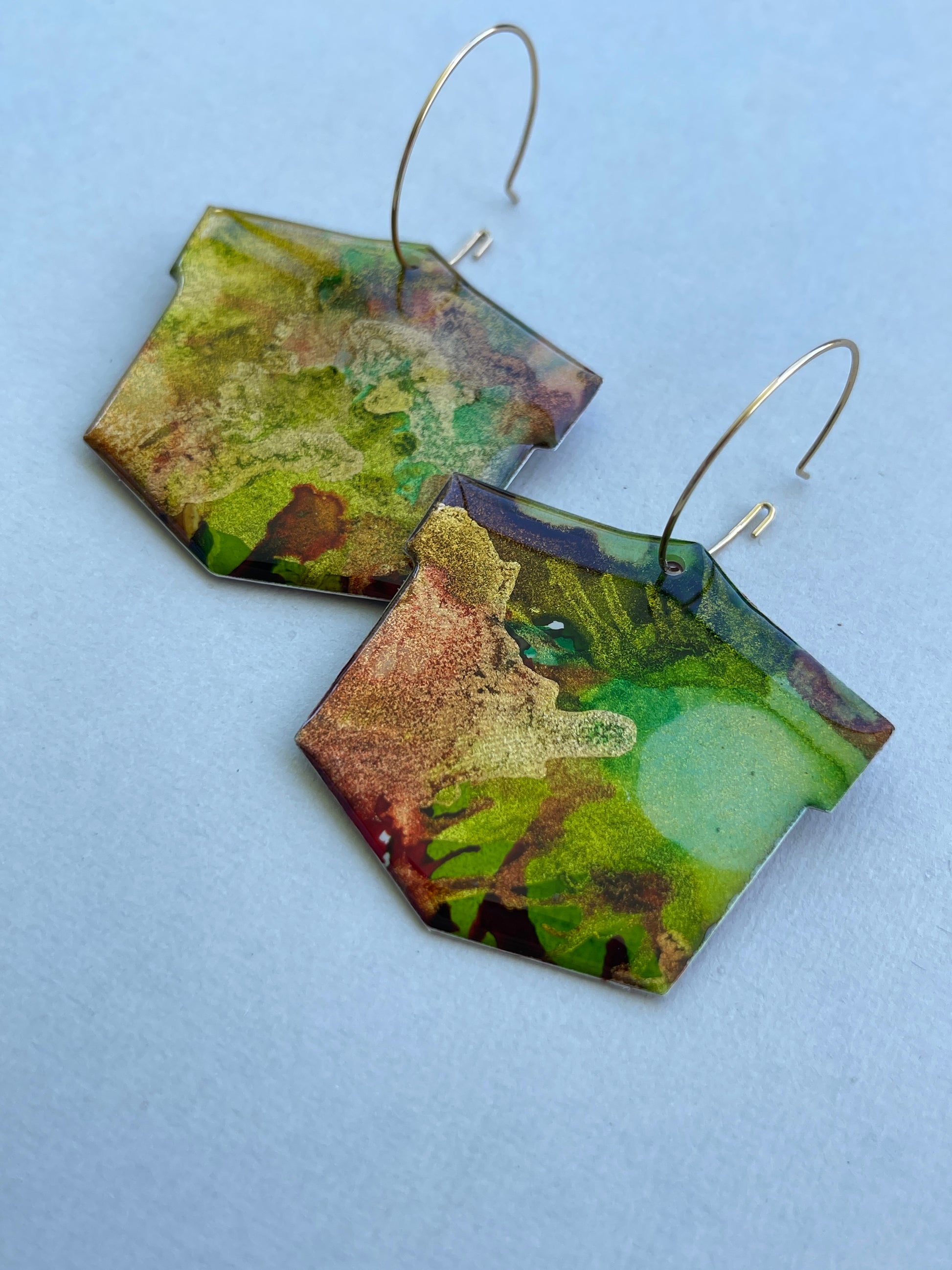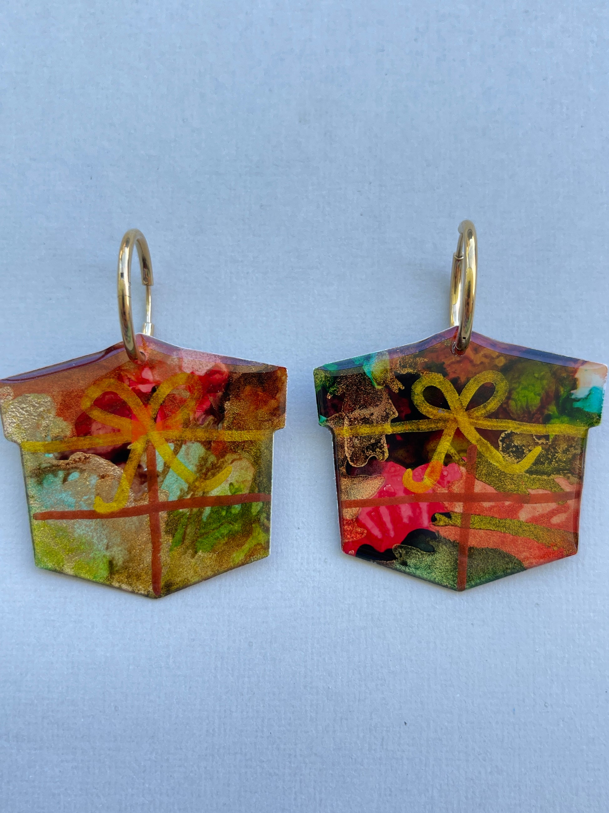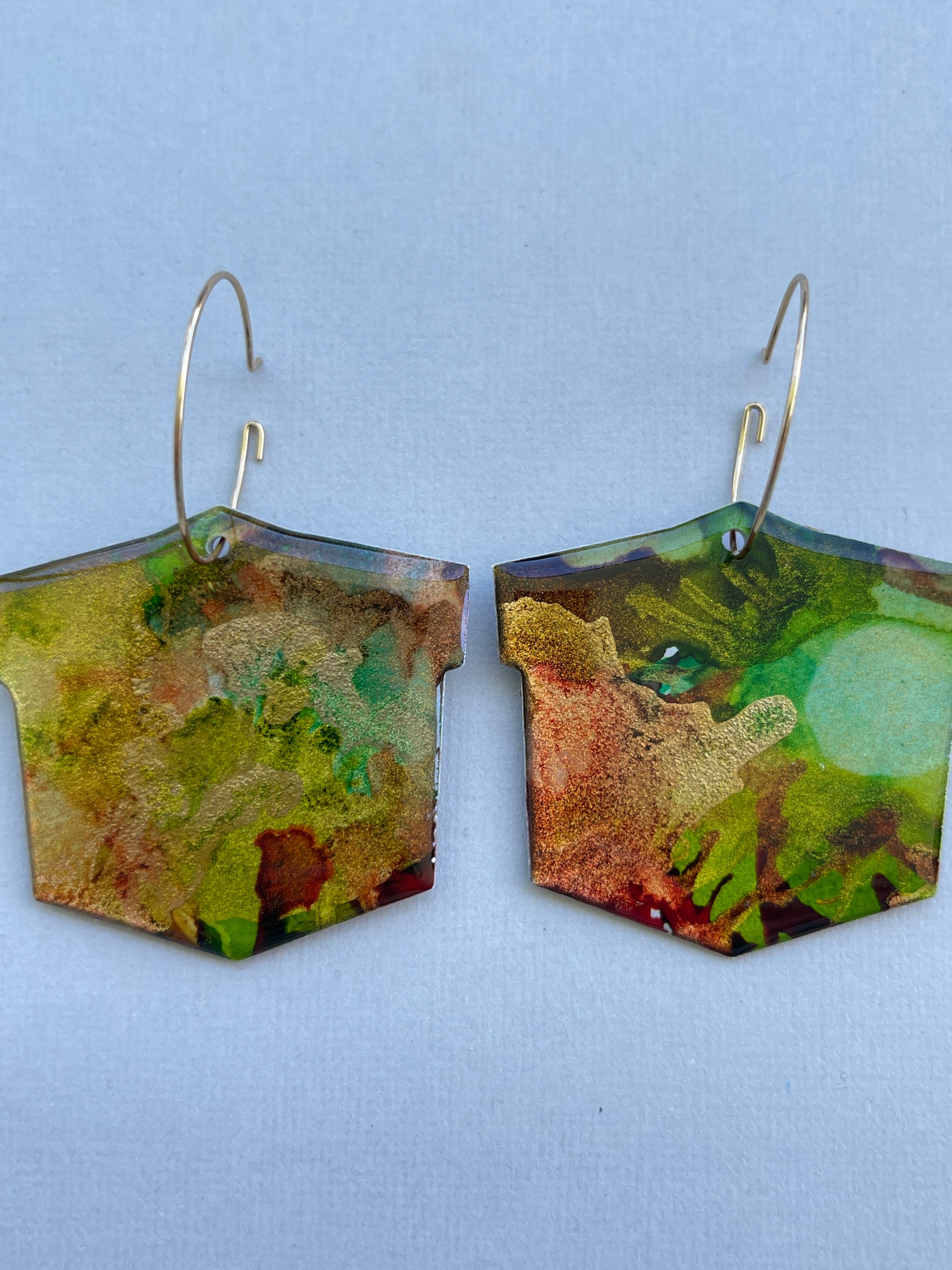 Made from a hand painted marble look with red green and gold, set on a 25mm gold plated stainless steel hoop.