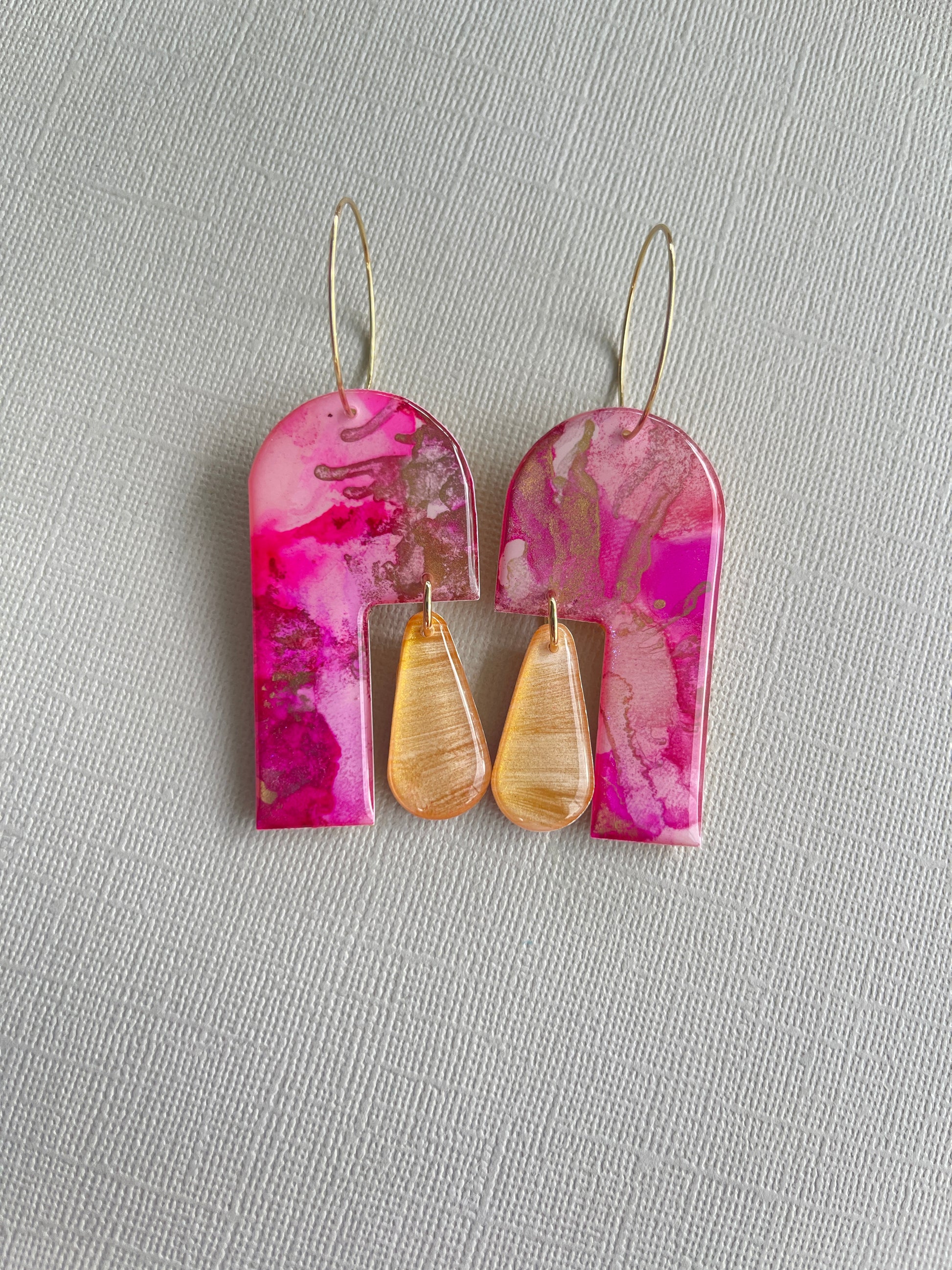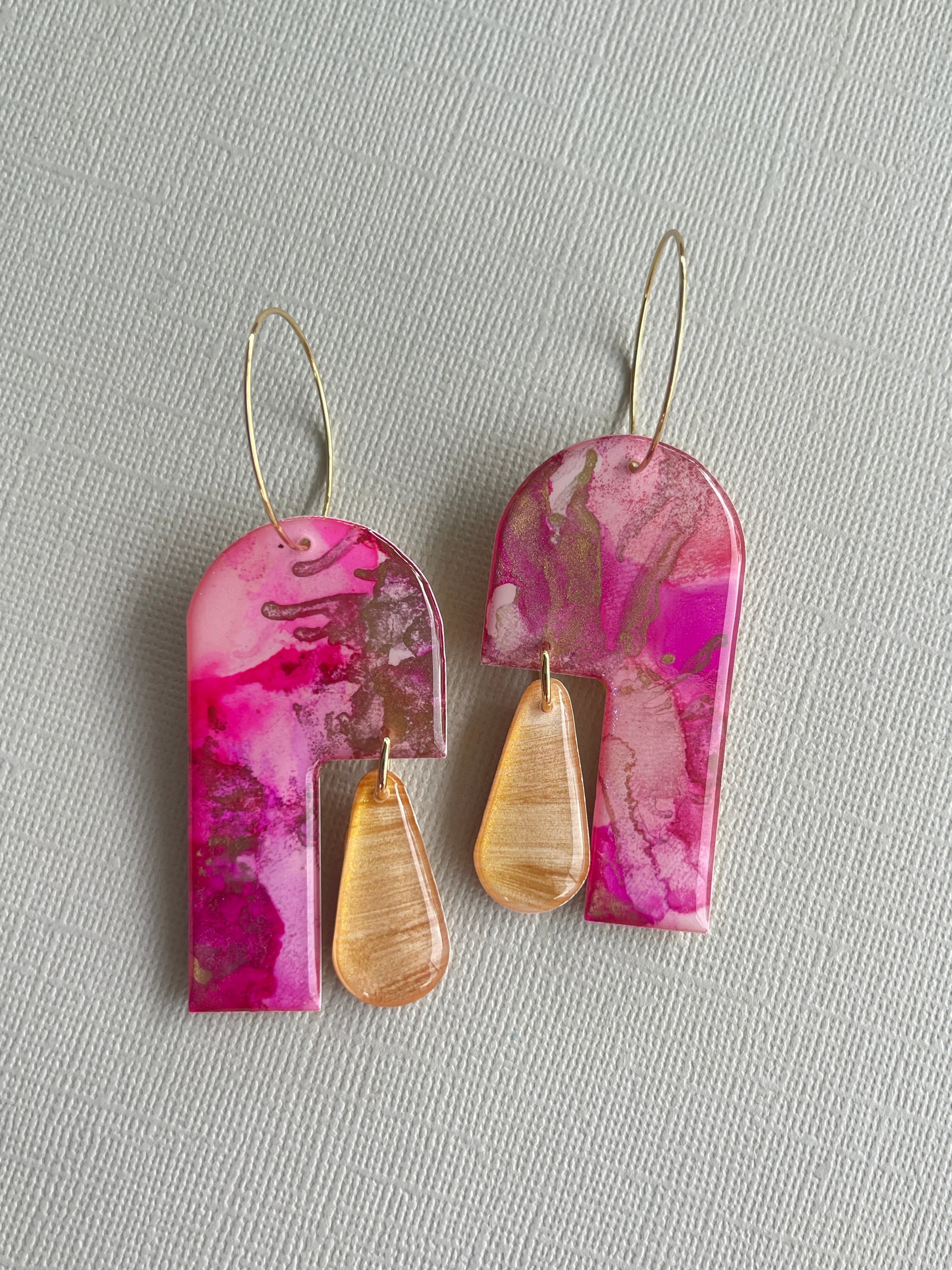 These earrings are made from a unique artwork handpainted by myself from alcohol ink in a pink & gold marble look. They are then sealed in resin for durability. Large stock levels are not always available, so please allow a lead time of up to two weeks to allow them to be hand made.