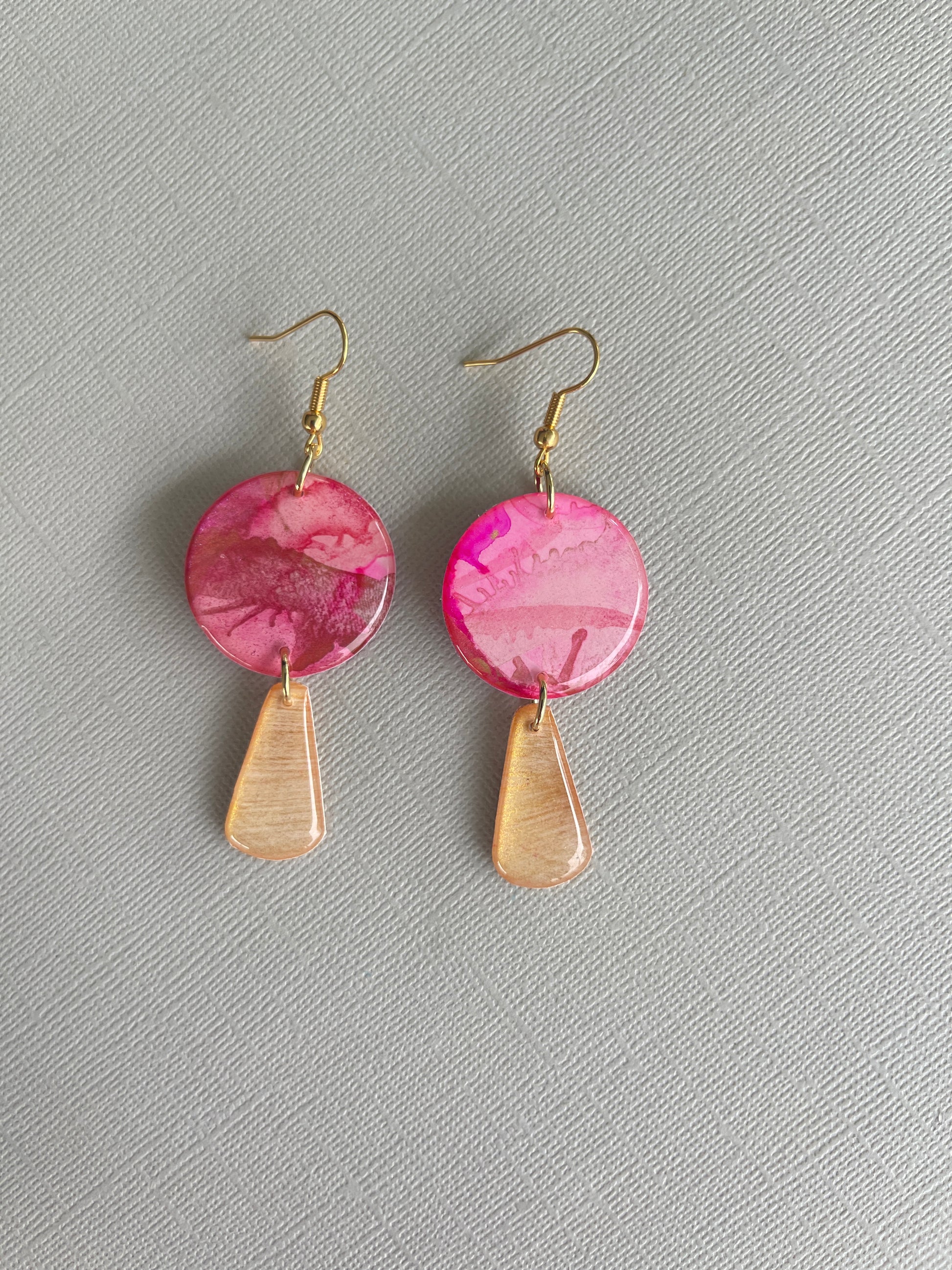 These earrings are made from a unique artwork handpainted by myself from alcohol ink in a pink & gold marble look. They are then sealed in resin for durability. Large stock levels are not always available, so please allow a lead time of up to two weeks to allow them to be hand made.