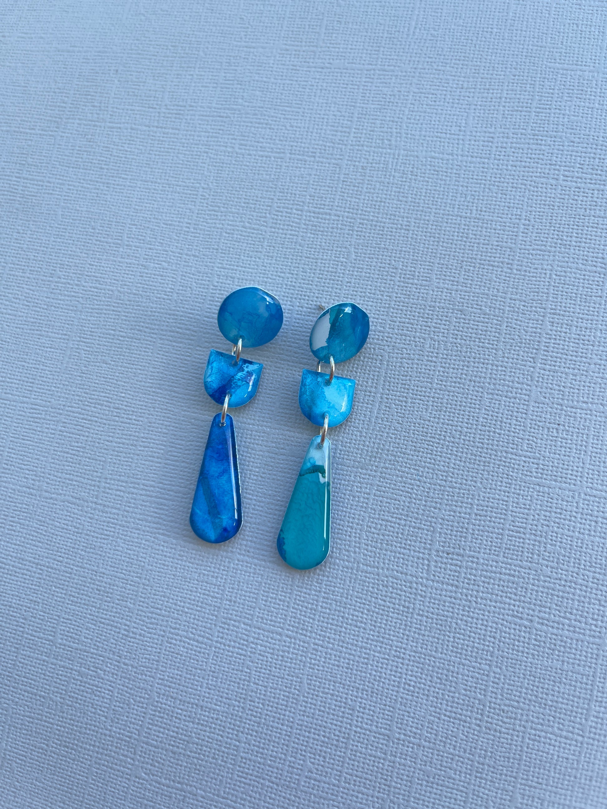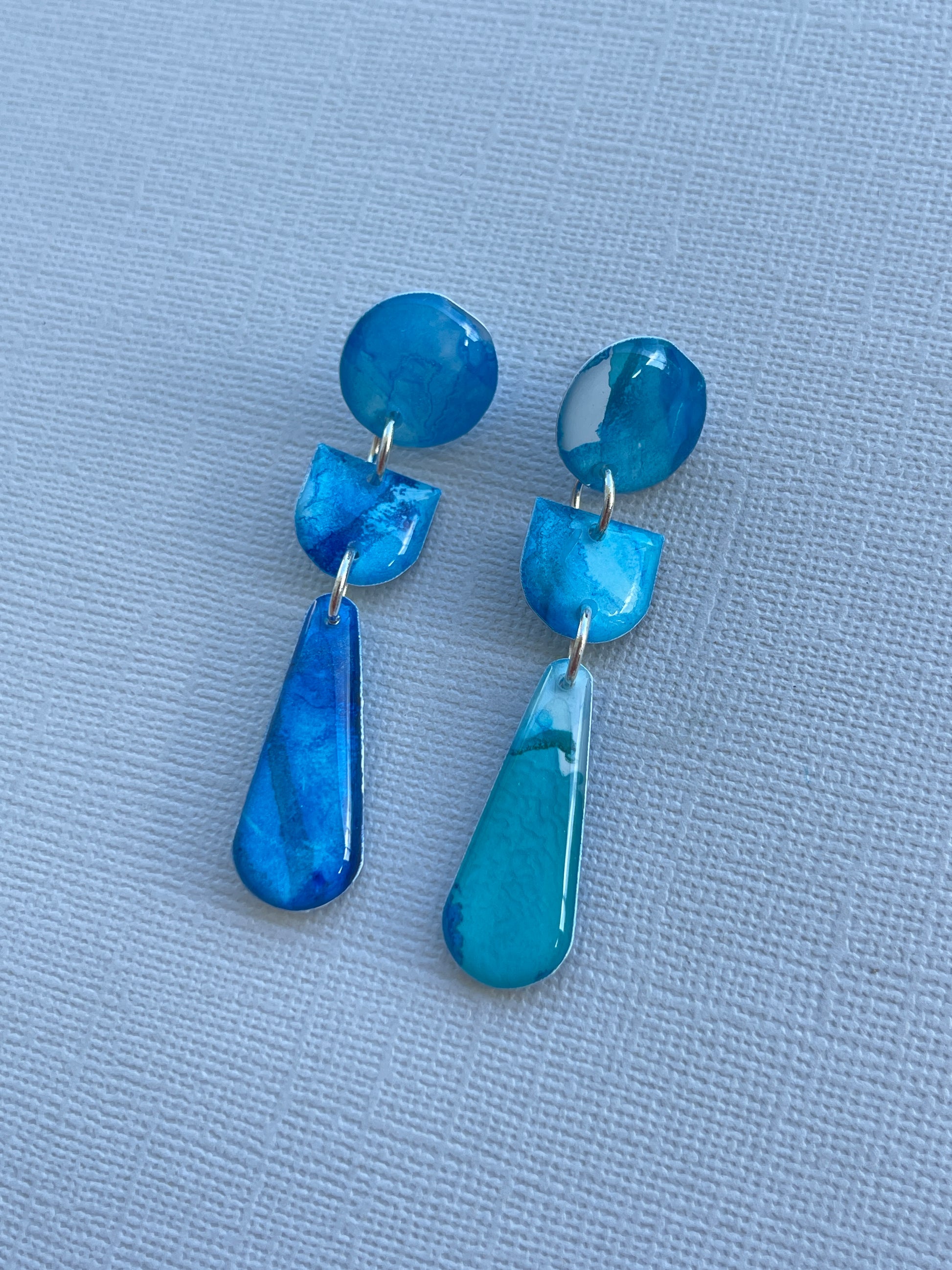 These earrings are made from a unique artwork handpainted by myself from alcohol ink in blue marble. They are then sealed in resin for durability. Large stock levels are not always available, so please allow a lead time of up to two weeks to allow them to be hand made.