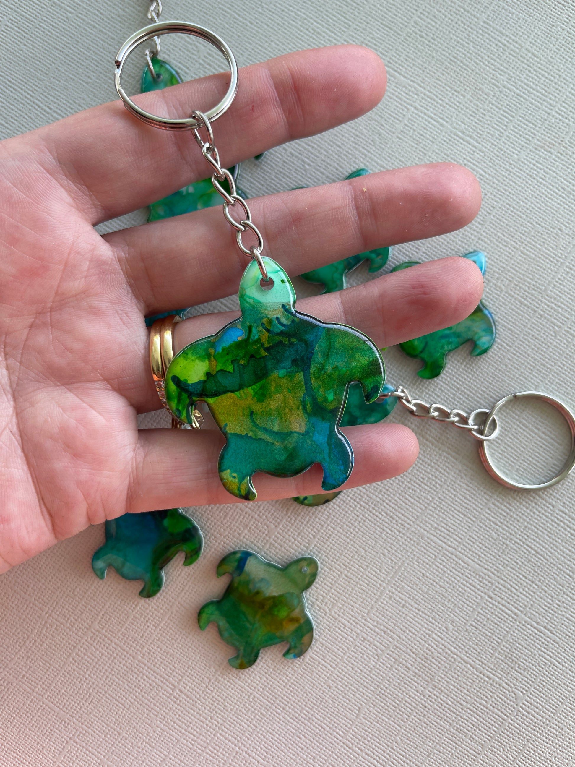 Made from handpainted artwork and sealed in resin. Approximately 5cm in height, with a silver keychain.