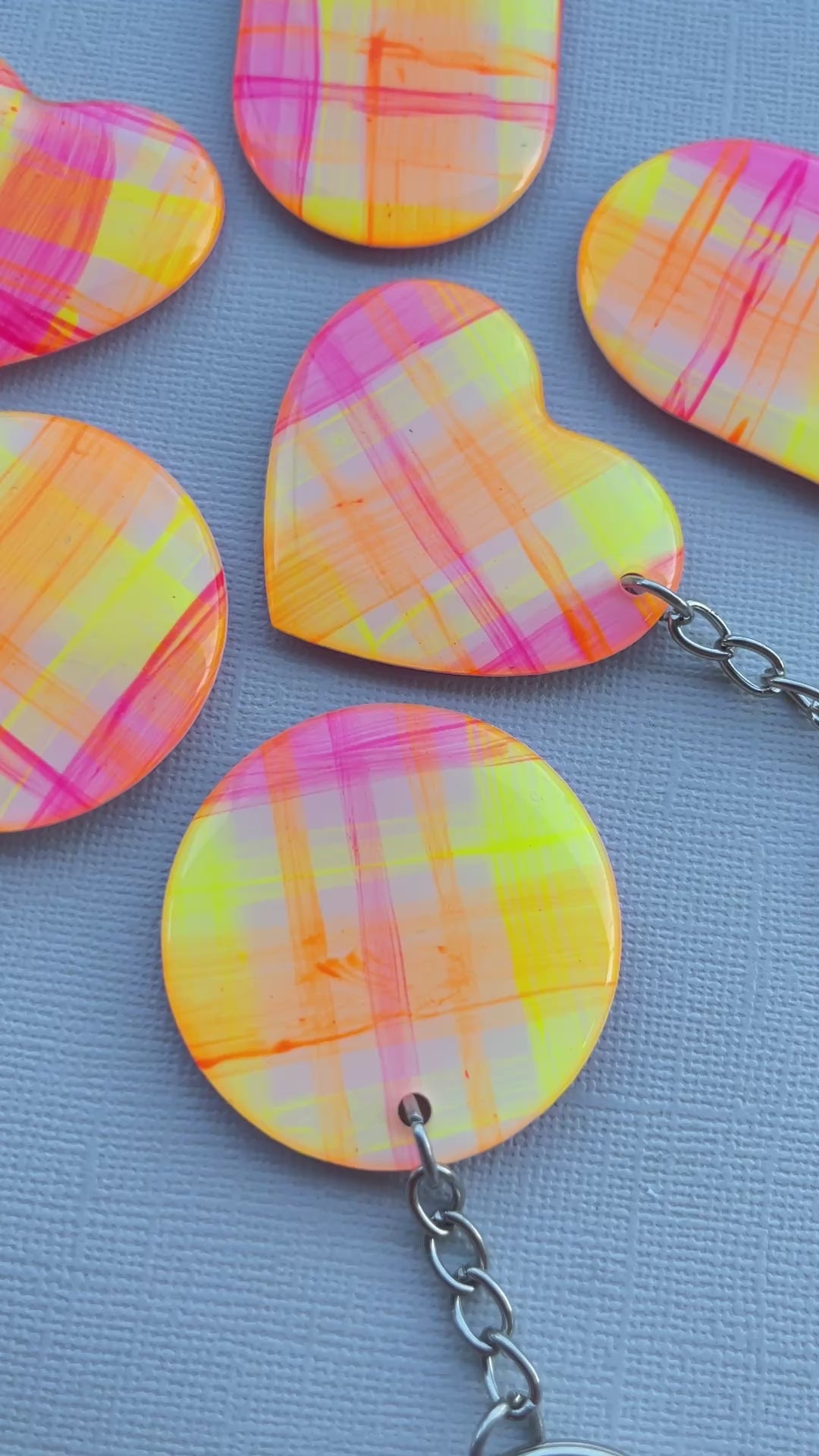 Made from handpainted artwork and sealed in resin. Approximately 5cm in height, with a silver keychain.